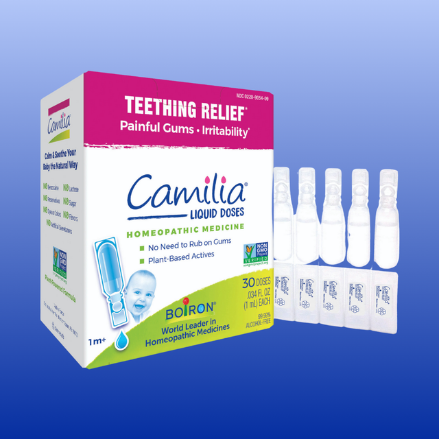 Boiron Camilia is a worry-free baby teething solution. It may provide relief of painful gums and irritability with traditional homeopathic medicines rather than general pain relievers or numbing agents.* Simply squeeze the small pre-measured dose into the baby’s mouth. The clear and tasteless liquid is absorbed sublingually.