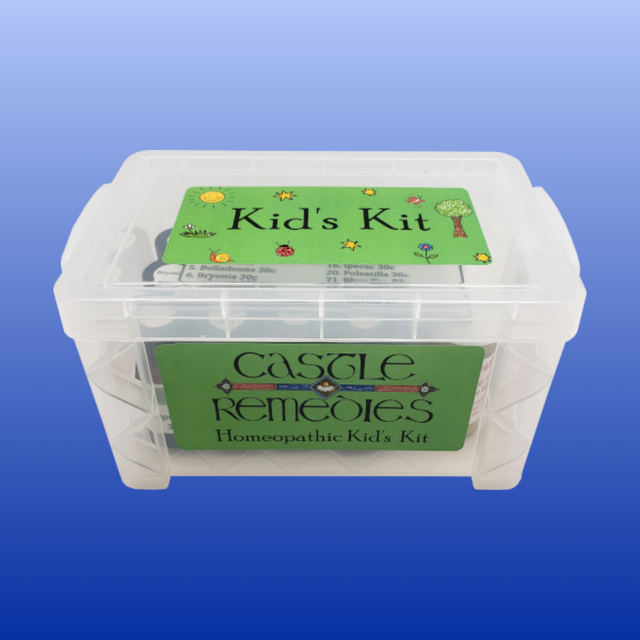 The Homeopathic Kid's Kit includes 12 of the most commonly used remedies. Each remedy is dispensed in a 2 dram amber glass bottle, each containing about 40 doses of pellets. The carrying case comes in several various colors including purple, blue, green, and clear.