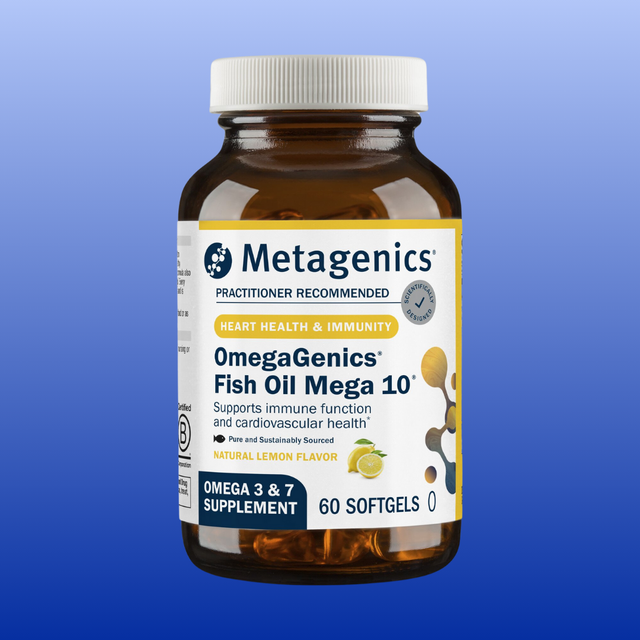 OmegaGenics® Mega 10® Fish Oil delivers a balanced blend of purified omega-7 and omega-3 fatty acids to provide targeted support for heart and immune health. Sourced from sustainably caught, cold-water fish, each batch undergoes rigorous testing for over 450 contaminants, including heavy metals and toxins.